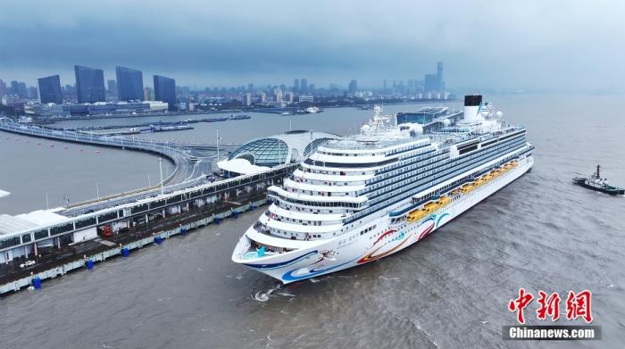 Aerial photo shows China's first domestically built cruise ship, the "Adora Magic City," at Shanghai Wusongkou International Cruise Terminal in east China's Shanghai. (China News Service/Yin Liqin)