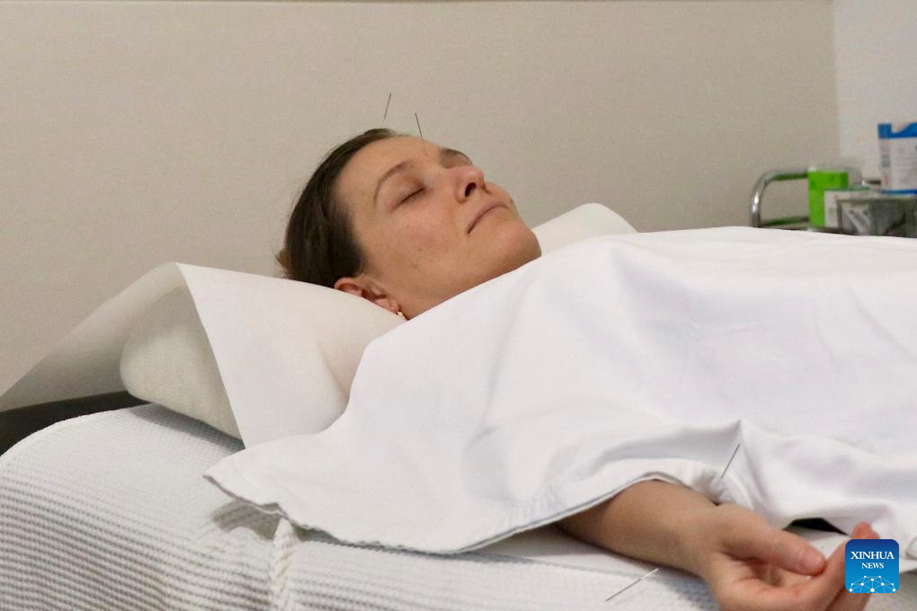 Patient Miroslava receives acupuncture therapy at the TCM-City clinic in Schaffhausen, Switzerland, Dec. 11, 2023. (Xinhua/Wang Qibing)