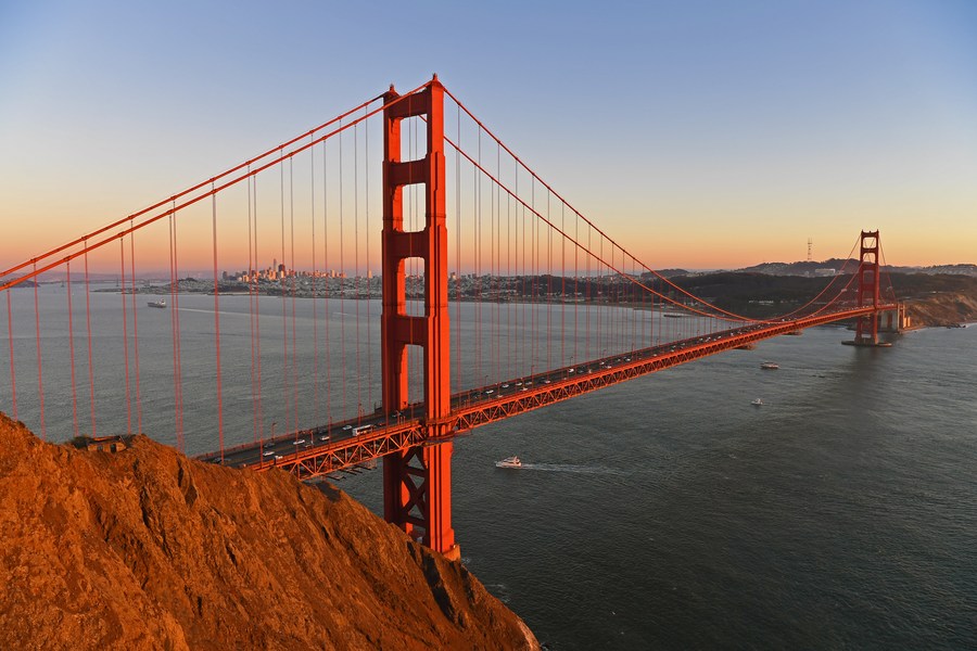 This photo taken on Nov. 11, 2023 shows the Golden Gate Bridge at sunset in San Francisco, the United States. (Xinhua/Li Rui)