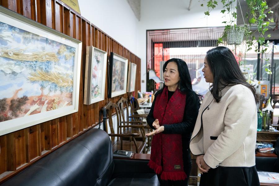Yang Qiaoyan (L) discusses with her friends about floral works at her workshop in Kunming, southwest China's Yunnan Province, Dec. 26, 2023. (Xinhua/Chen Xinbo)