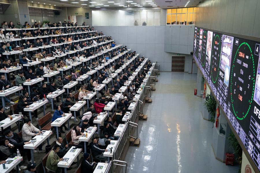 Dealers bid for fresh flowers at Dounan Flower Market in Kunming, southwest China's Yunnan Province, Dec. 26, 2023. (Xinhua/Chen Xinbo)