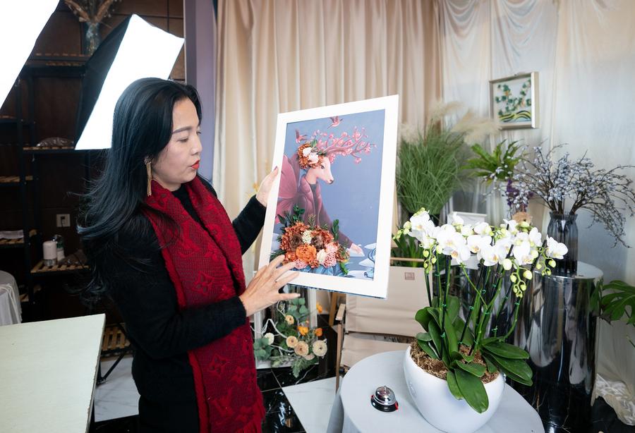 Yang Qiaoyan introduces her floral work on a livestream in Kunming, southwest China's Yunnan Province, Dec. 26, 2023. (Xinhua/Chen Xinbo)