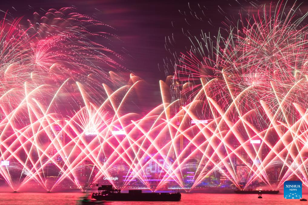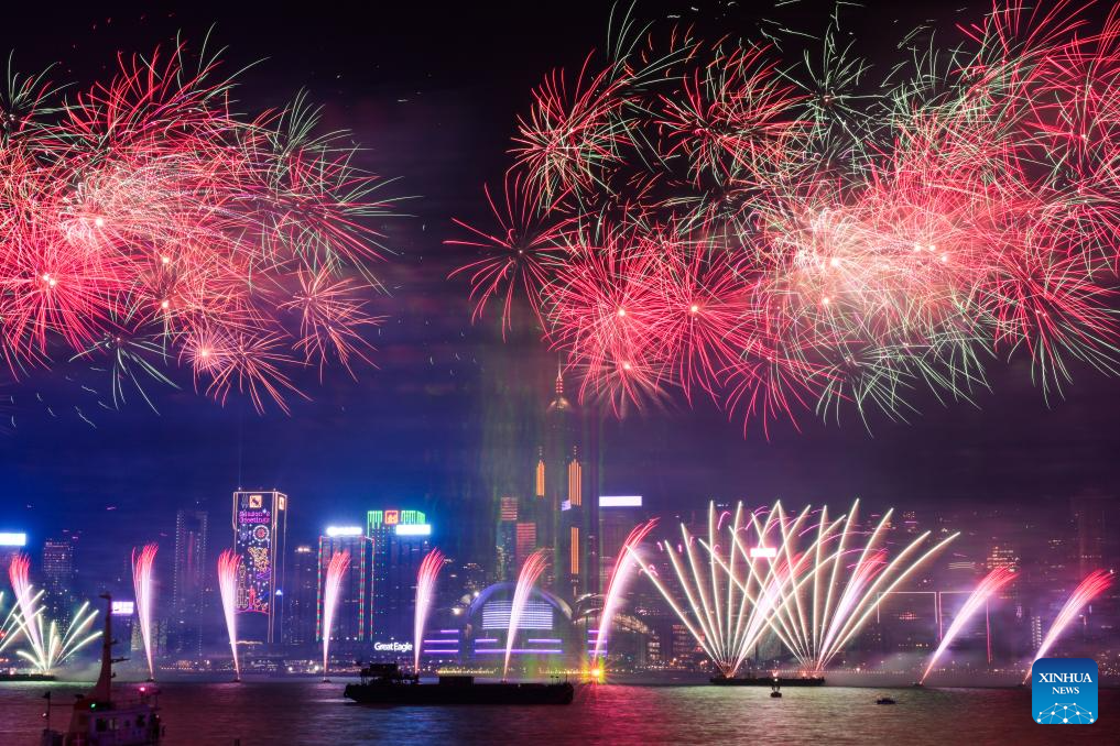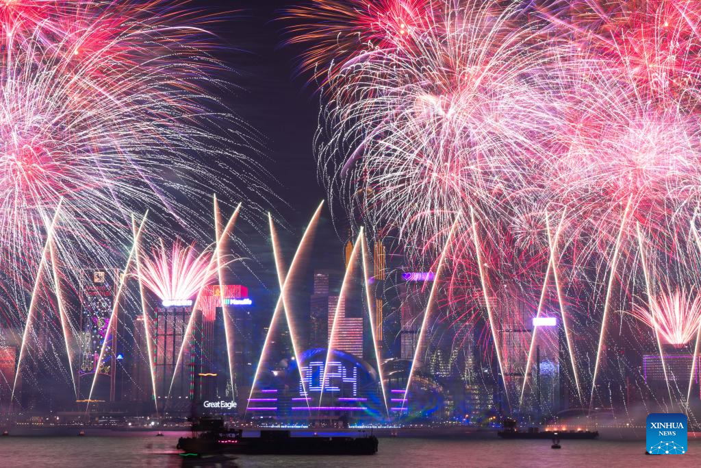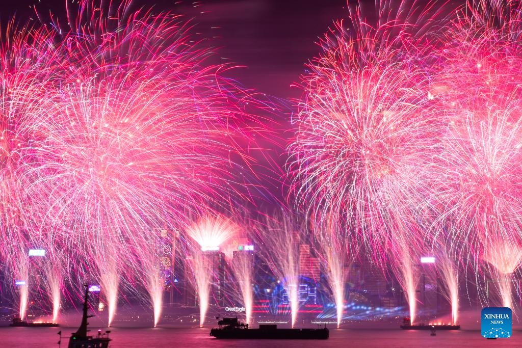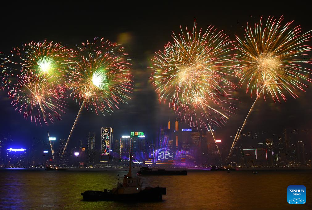 Fireworks in celebration of the New Year illuminate the sky over Victoria Harbour in Hong Kong, south China, Jan. 1, 2024. (Xinhua/Chen Duo)