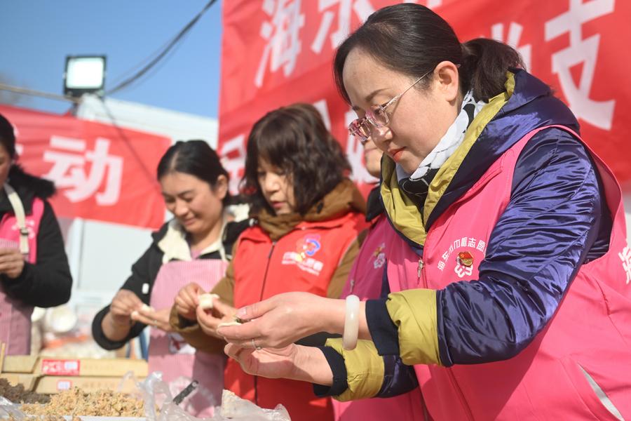 Volunteers prepare dumplings for villagers at a temporary relocation site in Caotan Village of Minhe Hui and Tu Autonomous County, Haidong City, northwest China's Qinghai Province, Jan. 1, 2024. (Xinhua/Zhang Long)