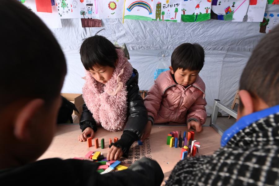 Children play in a prefabricated house at a temporary relocation site in Kexinmin Village of Dahejia Township, Jishishan County, northwest China's Gansu Province, Jan. 1, 2024. (Xinhua/Fan Peishen)