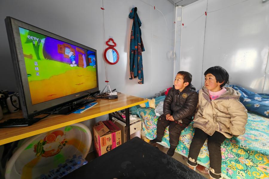 Children watch cartoon in a prefabricated house at a temporary relocation site in Xietao Village of Liugou Township, Jishishan County, northwest China's Gansu Province, Jan. 1, 2024. (Xinhua/Fan Peishen)