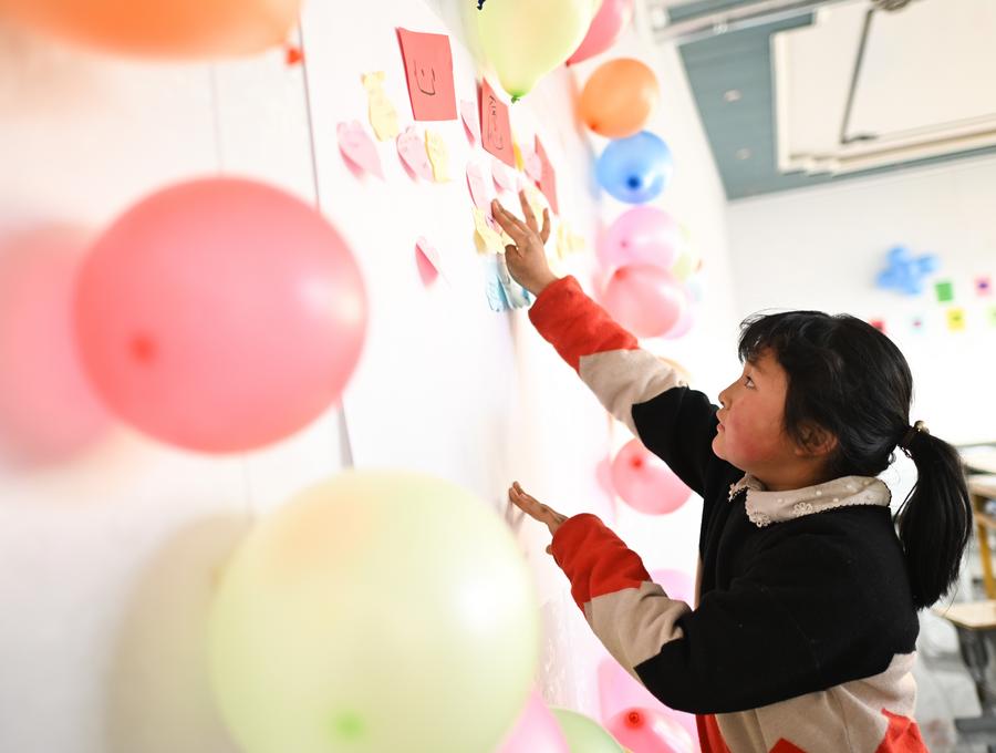 A girl sticks a note of wishes on the wish board at a temporary relocation site in Jintian Village of Minhe Hui and Tu Autonomous County, Haidong City, northwest China's Qinghai Province, Jan. 1, 2024. (Xinhua/Zhang Long)