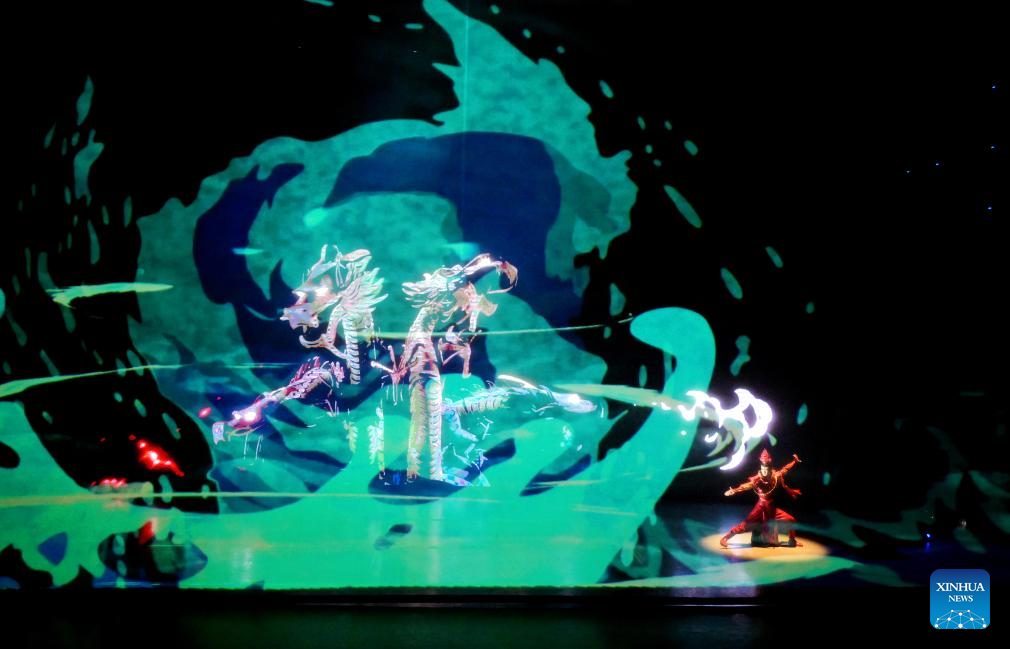 Artists perform a child play at a theater in Xi'an, northwest China's Shaanxi Province, Dec. 31, 2023. Dramas, concerts and shows for children were staged during the New Year holiday in the northwestern city of Xi'an. (Xinhua/Liu Xiao)