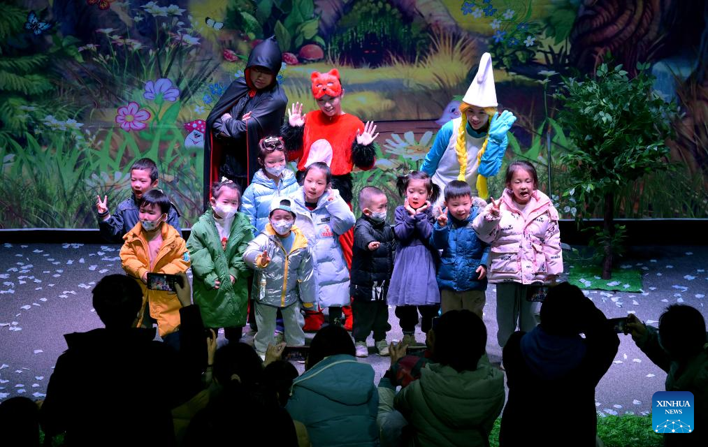 Artists perform a textbook-based play at a theater in Xi'an, northwest China's Shaanxi Province, Dec. 30, 2023. Dramas, concerts and shows for children were staged during the New Year holiday in the northwestern city of Xi'an. (Xinhua/Liu Xiao)