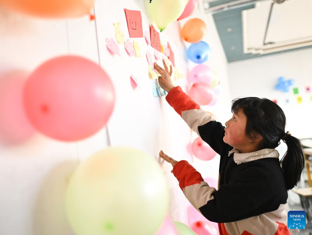 A girl sticks a note of wishes on the wish board at a temporary relocation site in Jintian Village of Minhe Hui and Tu Autonomous County, Haidong City, northwest China's Qinghai Province, Jan. 1, 2024. All forces continued to stick to their posts at the temporary relocation sites for quake-affected people in northwest China's Gansu Province and the neighboring Qinghai Province on the first day of 2024. (Xinhua/Zhang Long)