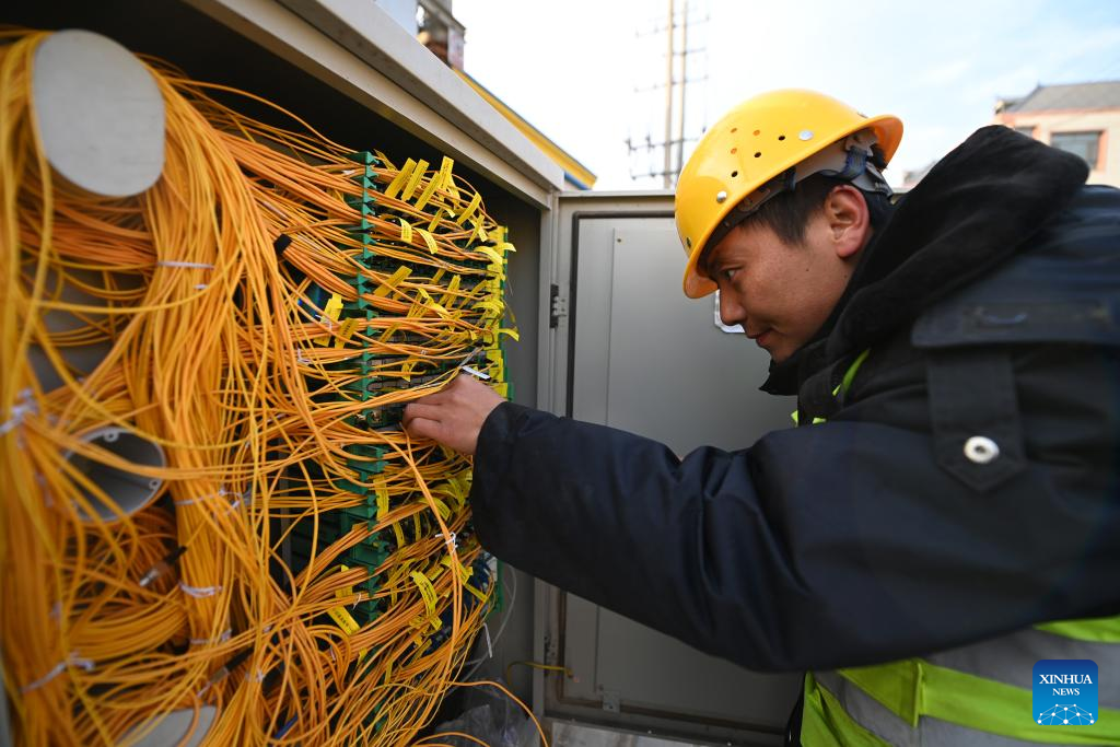 A technician works on fiber-optic cables for prefabricated houses at a temporary relocation site in Dahe Village of Dahejia Township, Jishishan County, northwest China's Gansu Province, Jan. 1, 2024. All forces continued to stick to their posts at the temporary relocation sites for quake-affected people in northwest China's Gansu Province and the neighboring Qinghai Province on the first day of 2024. (Xinhua/Fan Peishen)