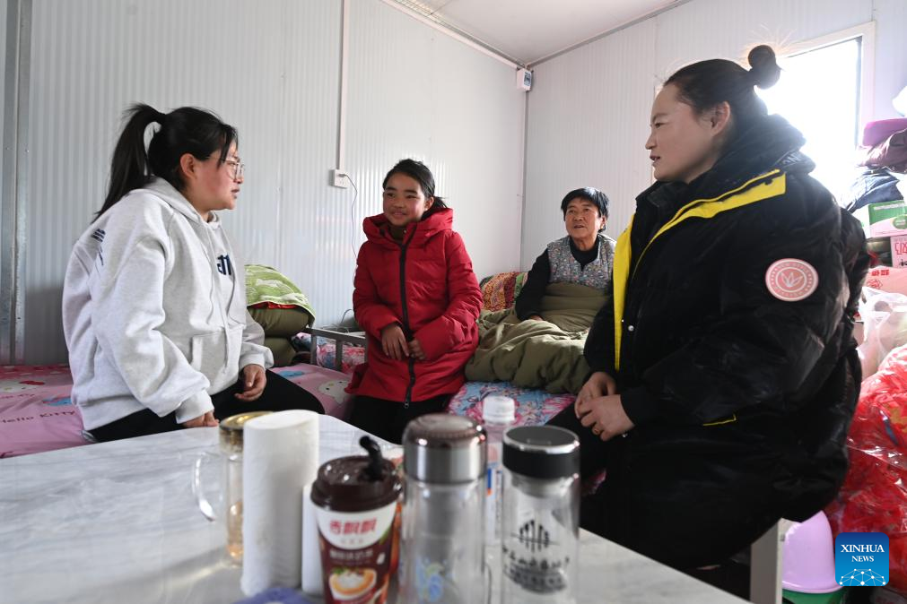 Local official Dong Xun (1st, L) visits villagers at a temporary relocation site in Kexinmin Village of Dahejia Township, Jishishan County, northwest China's Gansu Province, Jan. 1, 2024. All forces continued to stick to their posts at the temporary relocation sites for quake-affected people in northwest China's Gansu Province and the neighboring Qinghai Province on the first day of 2024. (Xinhua/Fan Peishen)