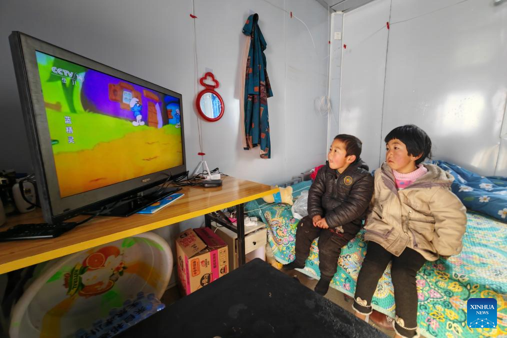Children watch cartoon in a prefabricated house at a temporary relocation site in Xietao Village of Liugou Township, Jishishan County, northwest China's Gansu Province, Jan. 1, 2024. All forces continued to stick to their posts at the temporary relocation sites for quake-affected people in northwest China's Gansu Province and the neighboring Qinghai Province on the first day of 2024. (Xinhua/Fan Peishen)
