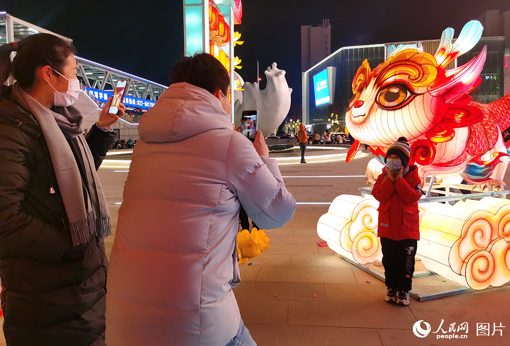 Residents take photos in front of a dragon-shaped lantern in north China's Tianjin, Dec. 31, 2023. (People's Daily Online/Tao Jian)