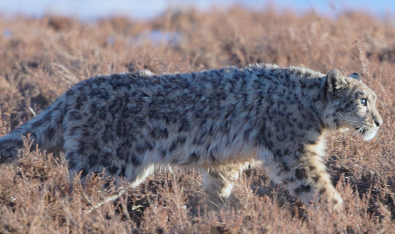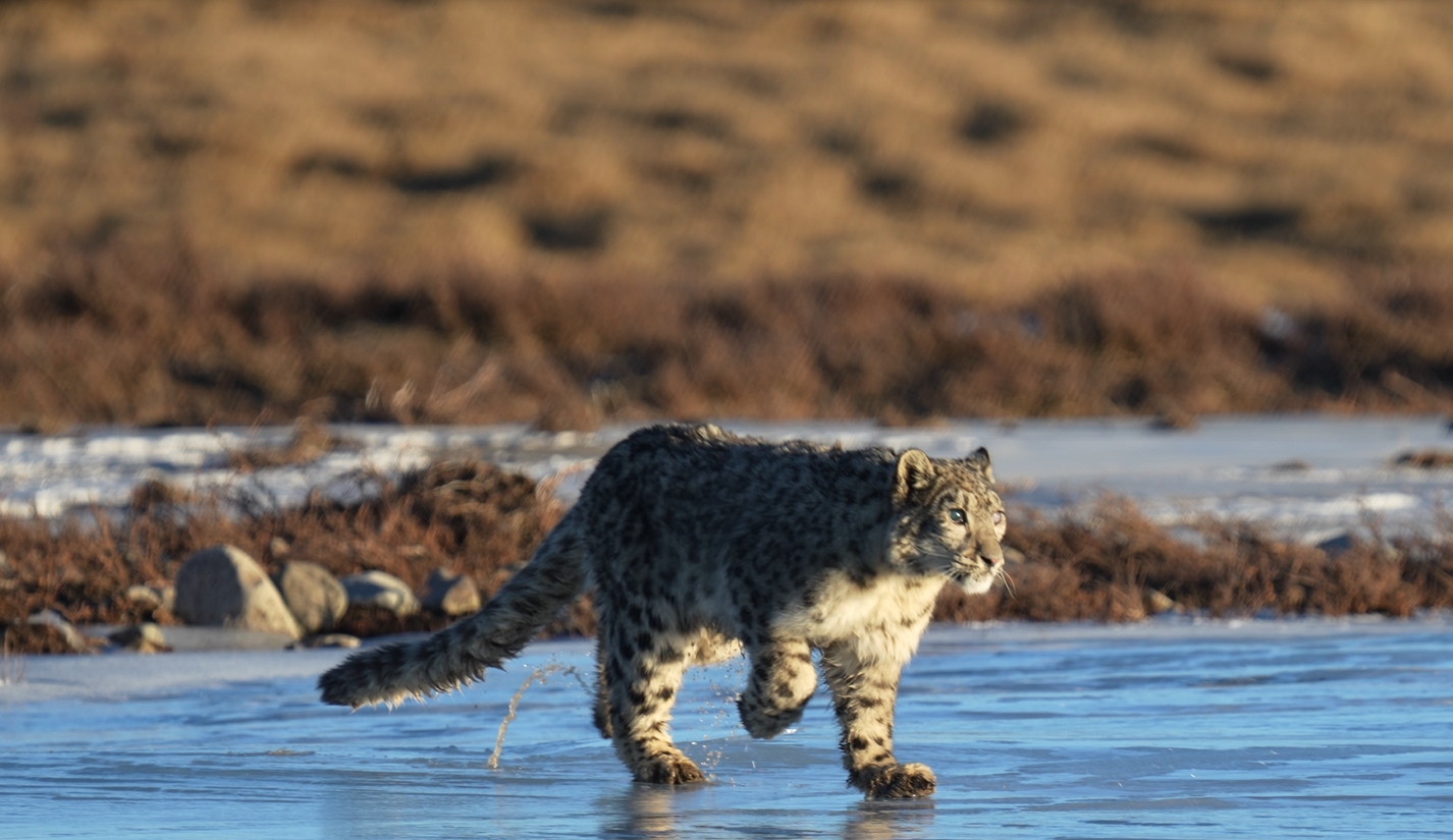 The rare sight of a snow leopard crossing a frozen lake was recently captured in Qilian Mountain National Park in Qilian county, northwest China's Qinghai Province. This marks the first time the area has recorded such valuable footage of a snow leopard's activities.