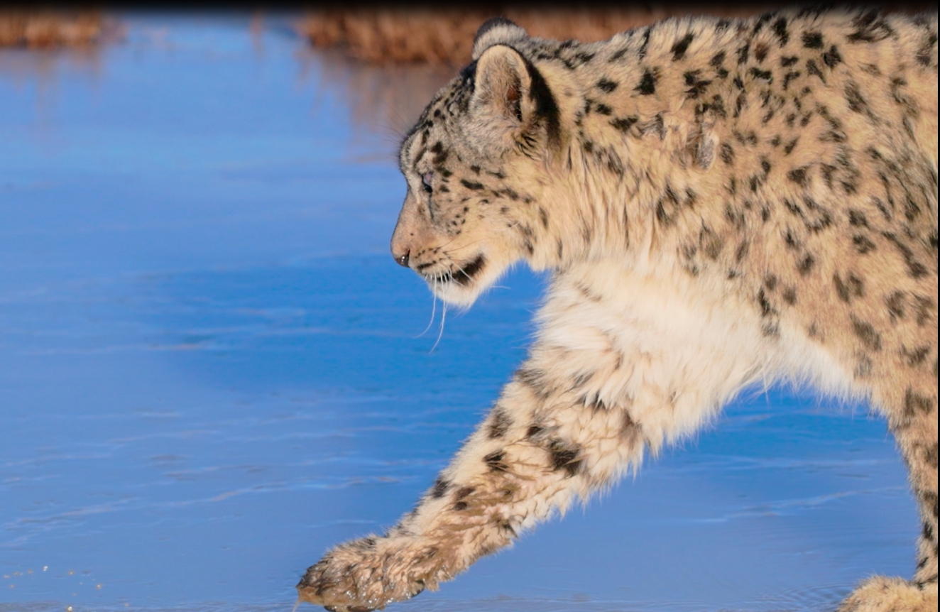 In the footage, the snow leopard is seen crawling through the grass and strolling around. Upon reaching the frozen lake, it cautiously approaches it, displaying an endearing demeanor. After crossing the lake, the leopard runs toward the grassland and eventually disappears from view.