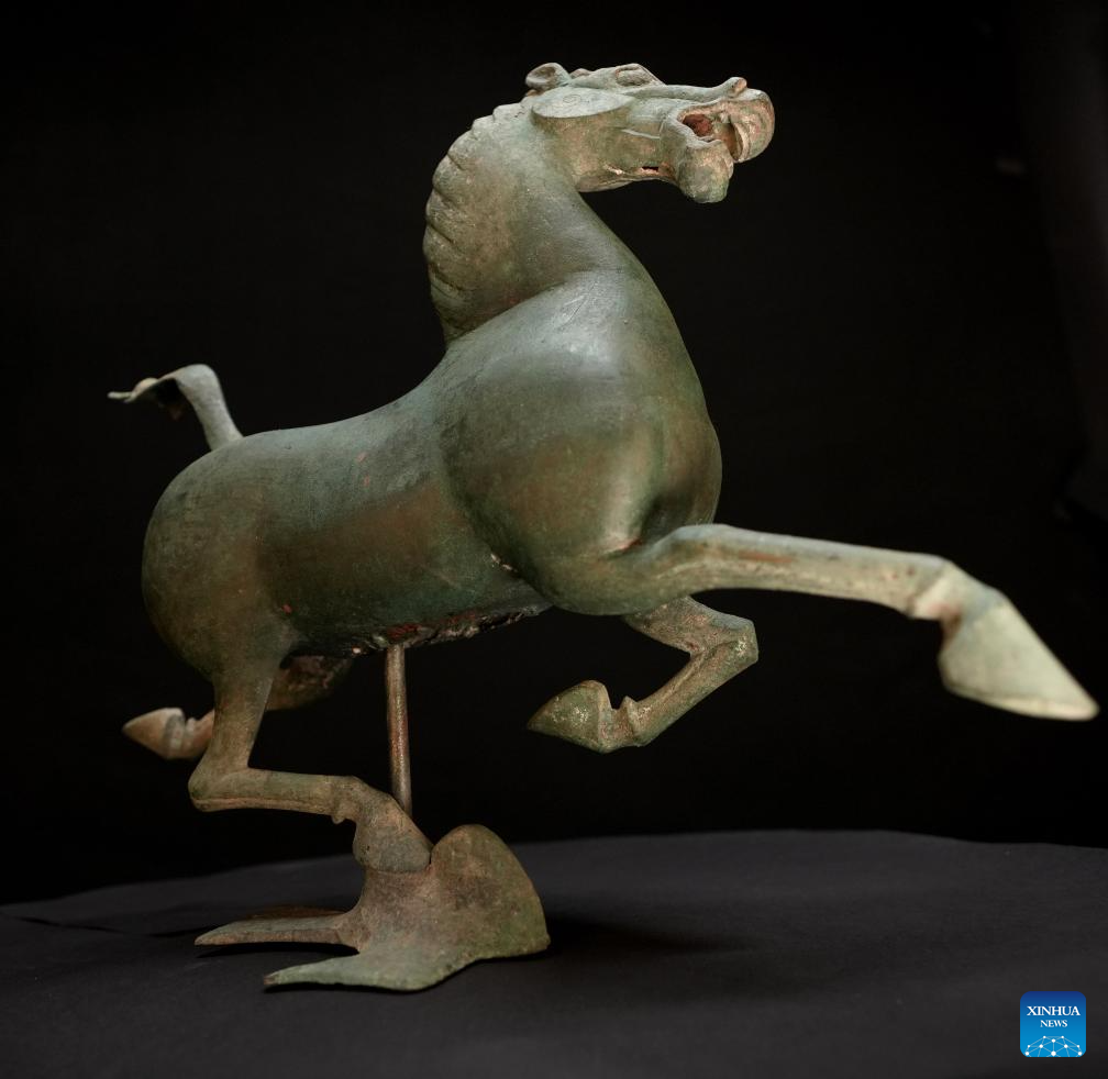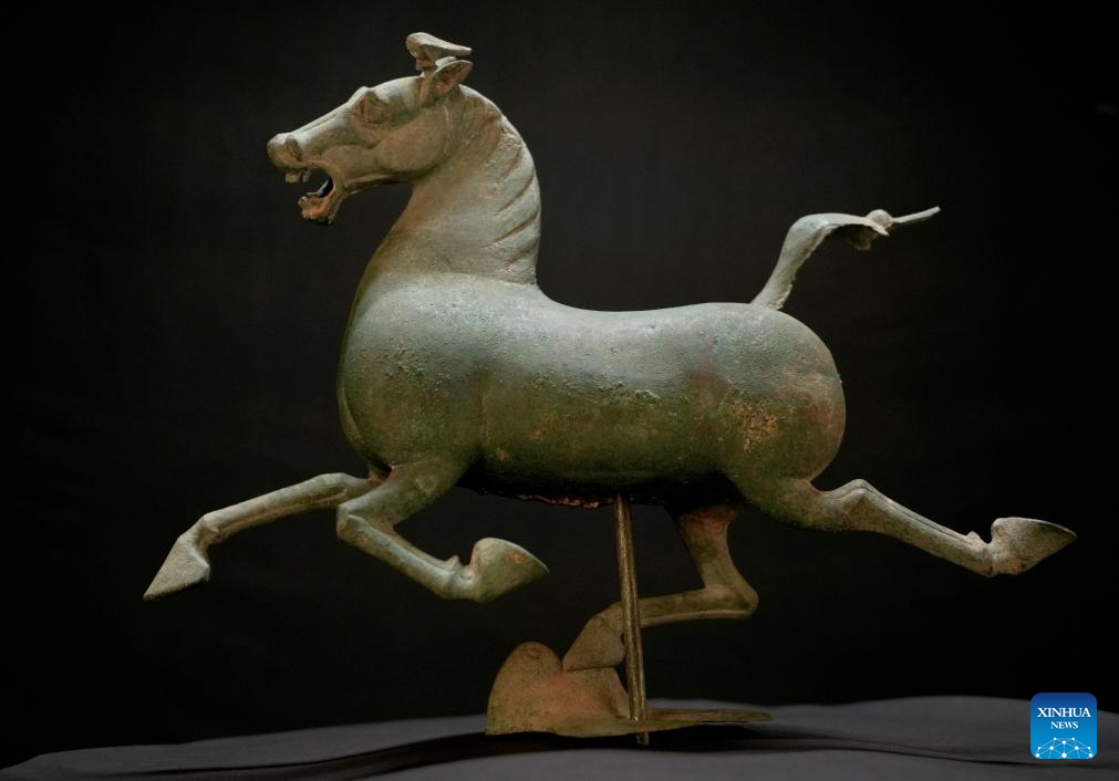 This photo taken on Oct. 27, 2023 shows the side view of an ancient bronze horse statue at Gansu Provincial Museum in Lanzhou, capital of northwest China's Gansu Province. The bronze horse statue, popularly known as "Bronze Galloping Horse Treading on a Flying Swallow," was unearthed in 1960s from the Leitai Tomb of the Eastern Han Dynasty (25-220 AD) in Wuwei of Gansu and is now preserved in the Gansu Provincial Museum. Its image became a symbol of Chinese tourism in 1983. (Xinhua/Wang Yuguo)