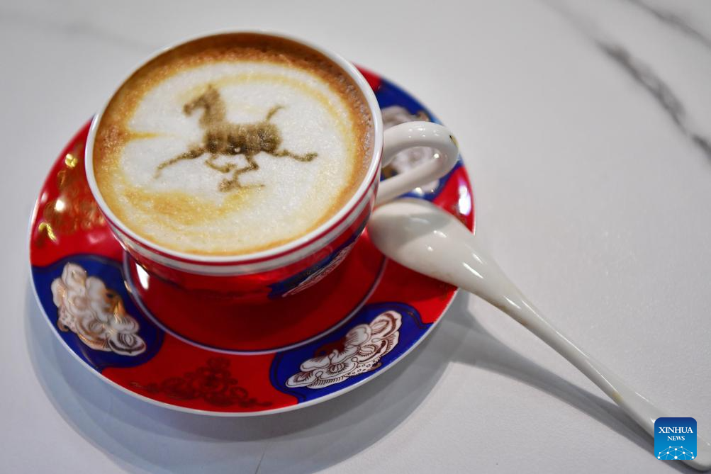 This photo taken on May 13, 2022 shows a cup of coffee with latte art featuring the image of an ancient bronze horse statue on its milk foam, served at a shop affiliated to Gansu Provincial Museum in Lanzhou, capital of northwest China's Gansu Province. The bronze horse statue, popularly known as "Bronze Galloping Horse Treading on a Flying Swallow," was unearthed in 1960s from the Leitai Tomb of the Eastern Han Dynasty (25-220 AD) in Wuwei of Gansu and is now preserved in the Gansu Provincial Museum. Its image became a symbol of Chinese tourism in 1983. (Xinhua/Chen Bin)