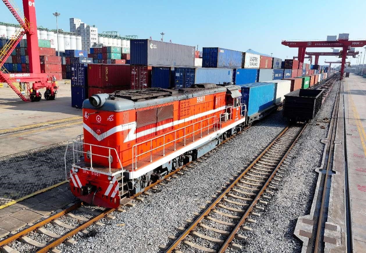 A China-Europe freight train departs from the China-Kazakhstan (Lianyungang) logistics cooperation base in east China's Jiangsu province for Central Asian countries, Jan. 1, 2024. (People's Daily Online/Wang Jianmin)