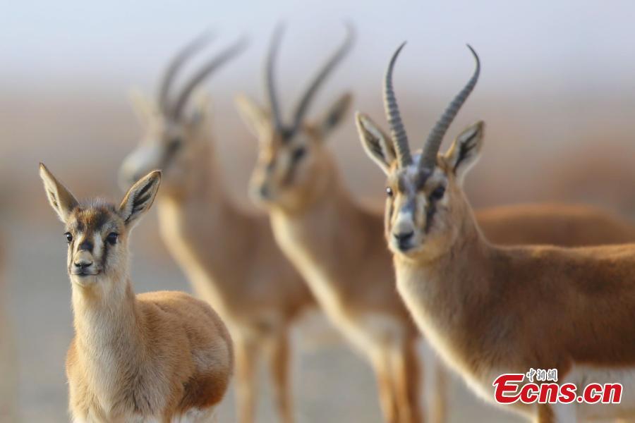 A herd of goitered gazelles are captured wandering on Nanshan Desert in Bohu county, Bayingolin Mongol Autonomous Prefecture, northwest China's Xinjiang Uygur Autonomous Region, Jan. 2, 2024. (Photo: China News Service/Nian Lei)