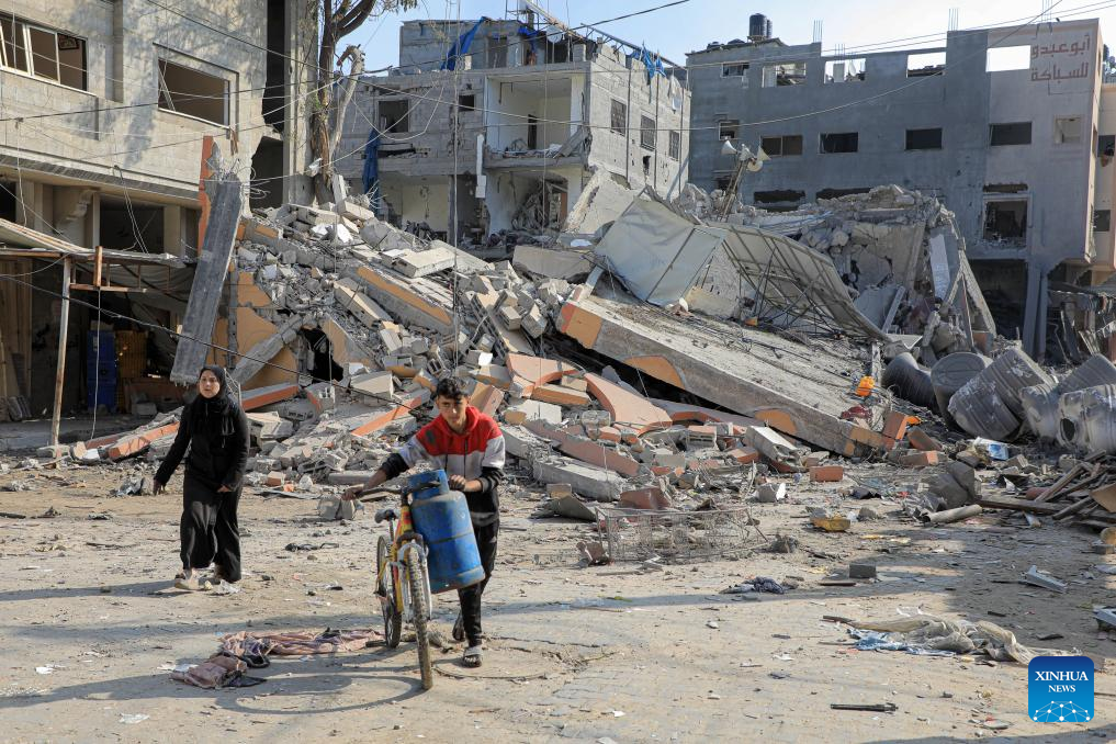 People walk past buildings destroyed in Israeli strikes in the southern Gaza Strip city of Khan Younis, on Jan. 4, 2024. Palestinian death toll from Israeli strikes on the Gaza Strip rose to 22,438 since the Israel-Hamas conflict broke out on Oct. 7, 2023, said the Gaza-based Health Ministry on Thursday. (Photo by Rizek Abdeljawad/Xinhua)