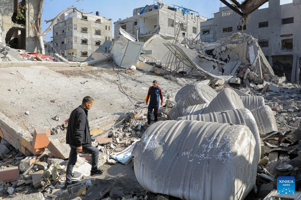 People walk among the rubble of buildings destroyed in Israeli strikes in the southern Gaza Strip city of Khan Younis, on Jan. 4, 2024. Palestinian death toll from Israeli strikes on the Gaza Strip rose to 22,438 since the Israel-Hamas conflict broke out on Oct. 7, 2023, said the Gaza-based Health Ministry on Thursday. (Photo by Rizek Abdeljawad/Xinhua)