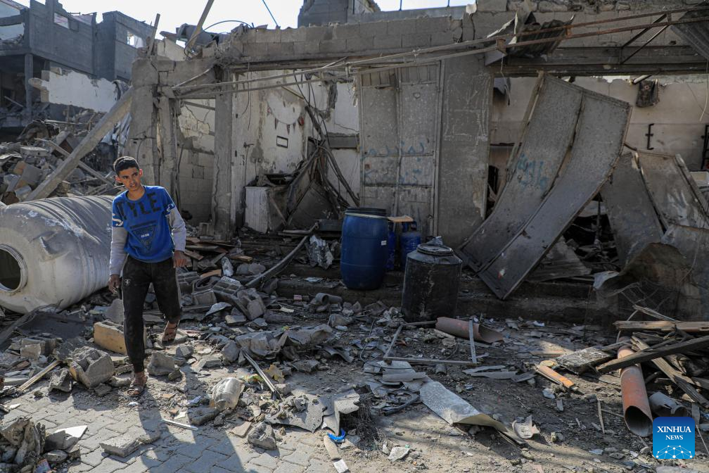 A man walks among the rubble of buildings destroyed in Israeli strikes in the southern Gaza Strip city of Khan Younis, on Jan. 4, 2024. Palestinian death toll from Israeli strikes on the Gaza Strip rose to 22,438 since the Israel-Hamas conflict broke out on Oct. 7, 2023, said the Gaza-based Health Ministry on Thursday. (Photo by Rizek Abdeljawad/Xinhua)