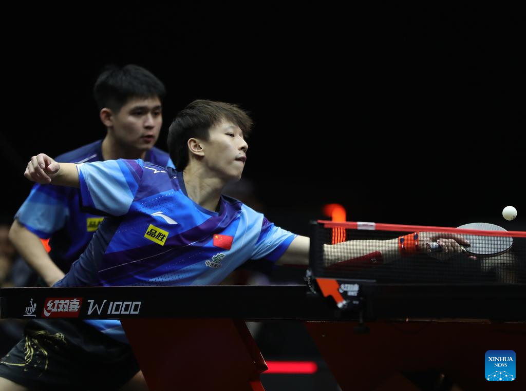Lin Gaoyuan (L)/Lin Shidong of China compete during the men's doubles quarterfinal between Lin Gaoyuan/Lin Shidong of China and Dimitrij Ovtcharov/Patrick Franziska of Germany at WTT Finals Men Doha 2023 table tennis tournament in Doha, Qatar, Jan. 4, 2024. (Xinhua/Wang Dongzhen)