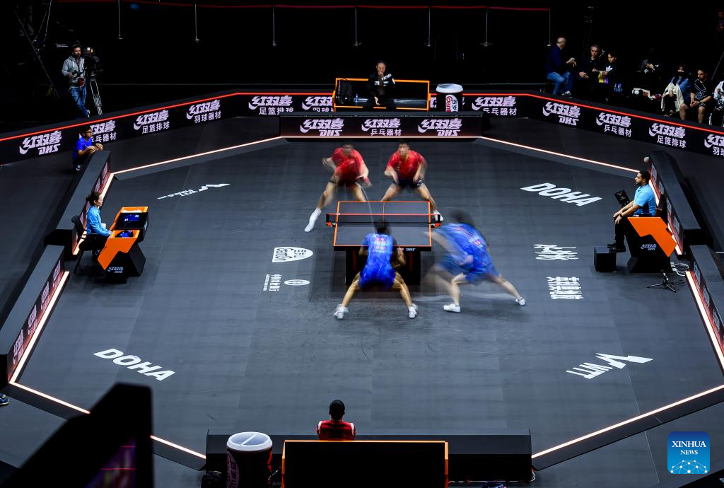 General view of the men's doubles quarterfinal between Yuan Licen/Xiang Peng of China and Togami Shunsuke/Uda Yukiya of Japan at WTT Finals Men Doha 2023 table tennis tournament in Doha, Qatar, Jan. 4, 2024. (Photo by Nikku/Xinhua)