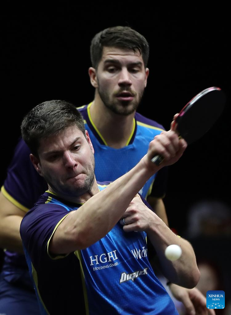 Dimitrij Ovtcharov (front)/Patrick Franziska of Germany compete during the men's doubles quarterfinal between Lin Gaoyuan/Lin Shidong of China and Dimitrij Ovtcharov/Patrick Franziska of Germany at WTT Finals Men Doha 2023 table tennis tournament in Doha, Qatar, Jan. 4, 2024. (Xinhua/Wang Dongzhen)