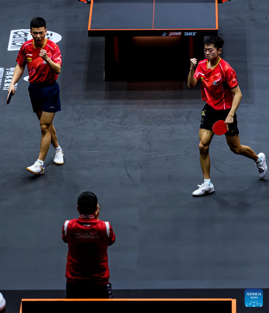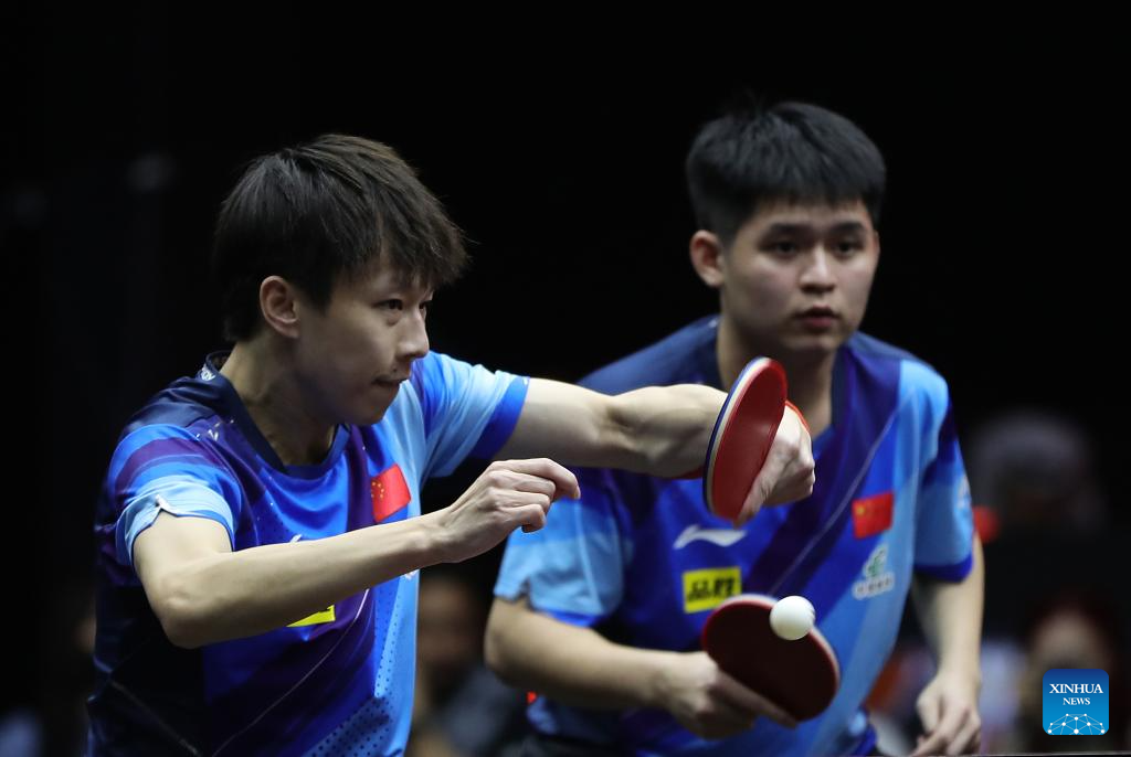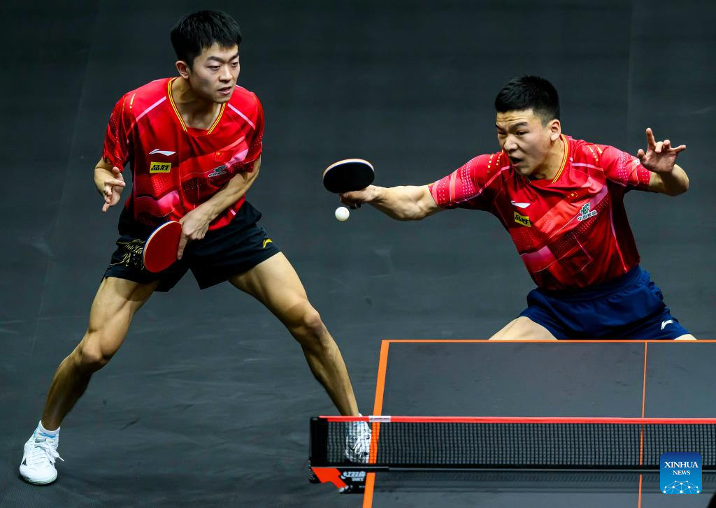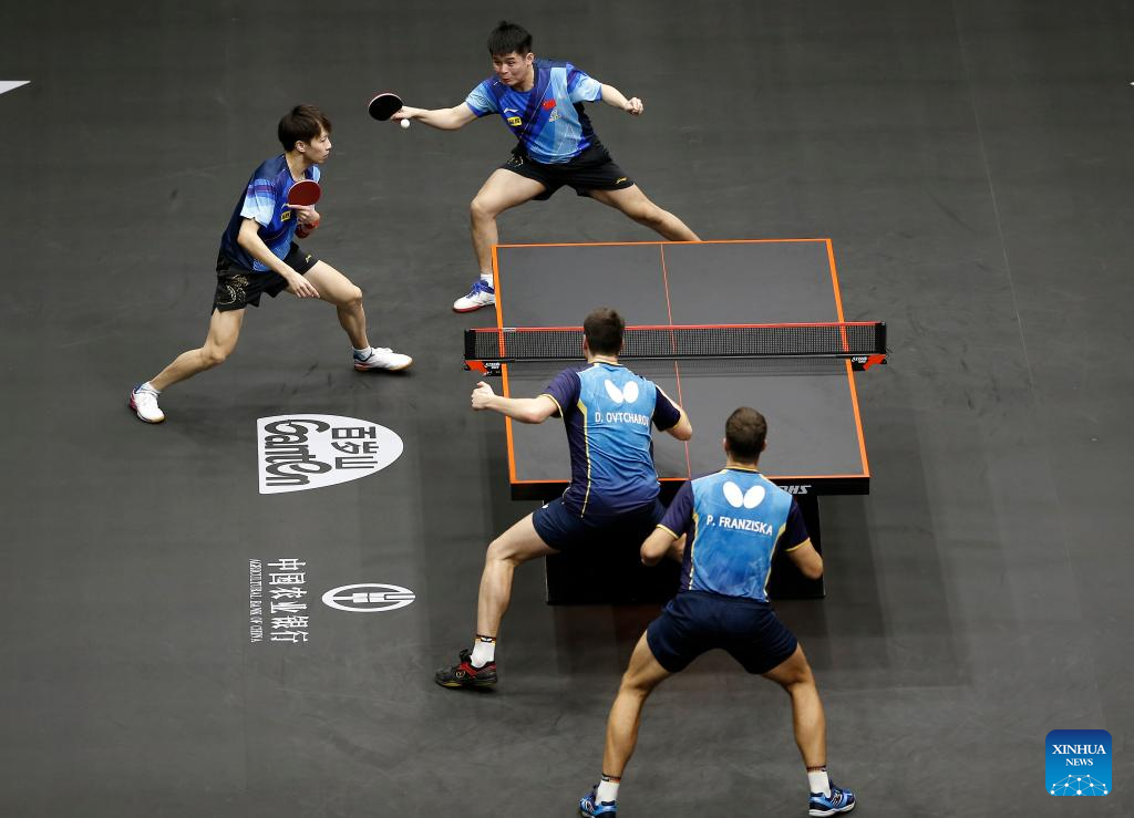 Lin Gaoyuan (R)/Lin Shidong of China compete during the men's doubles quarterfinal between Lin Gaoyuan/Lin Shidong of China and Dimitrij Ovtcharov/Patrick Franziska of Germany at WTT Finals Men Doha 2023 table tennis tournament in Doha, Qatar, Jan. 4, 2024. (Xinhua/Wang Dongzhen)