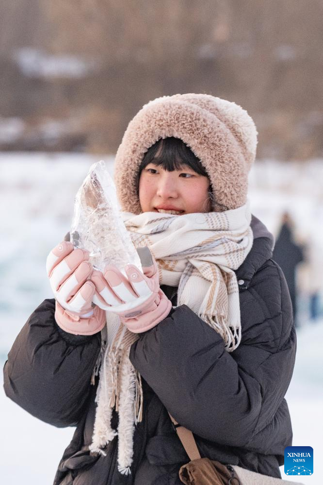 A tourist watches a cube of ice at an ice amusement spot on the Songhuajiang River Harbin section in Harbin, northeast China's Heilongjiang Province, Jan. 7, 2024. Dubbed China's "ice city," Harbin has recently seen a tourism boom. An ice amusement spot, transformed from an ice collecting site out of use, has attracted lots of visitors to have fun here with ice packs scattered on the Songhuajiang River Harbin section. (Xinhua/Xie Jianfei)