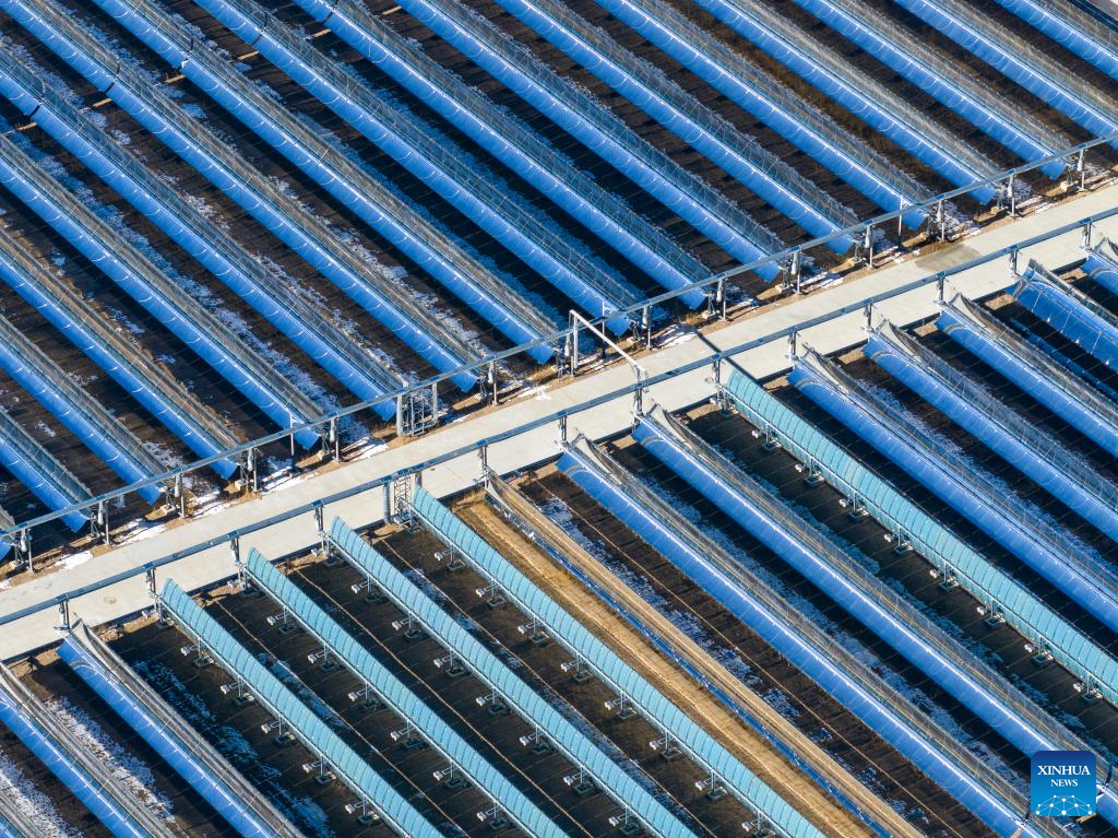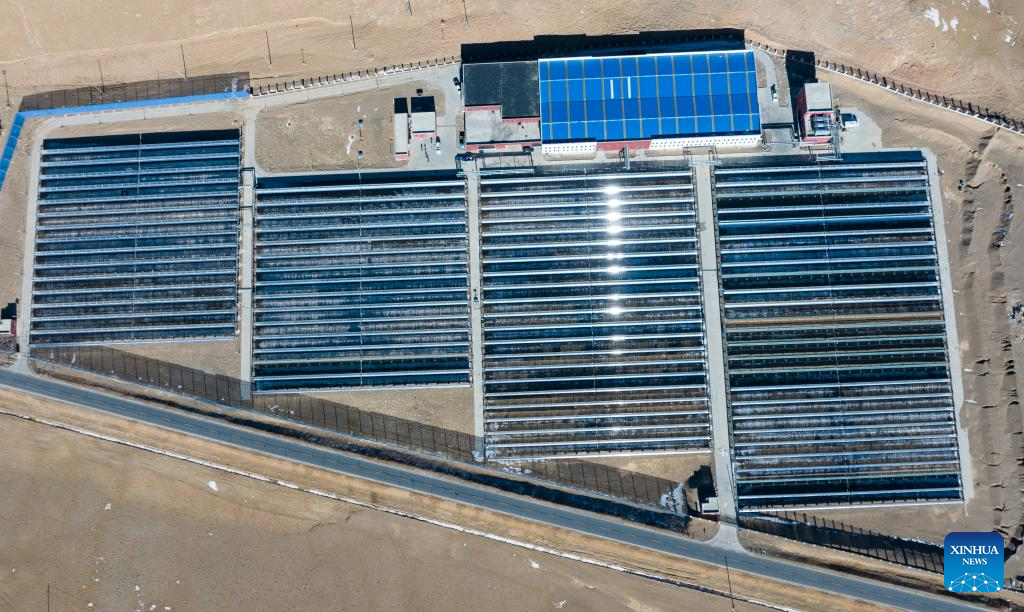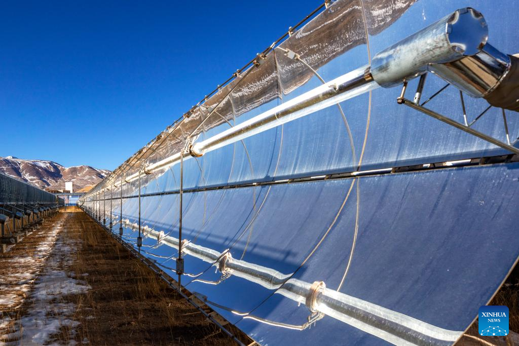 This photo taken on Jan. 6, 2024 shows solar thermal collectors at a heating plant in Xainza County, southwest China's Xizang Autonomous Region.?(Xinhua/Cao Bin)