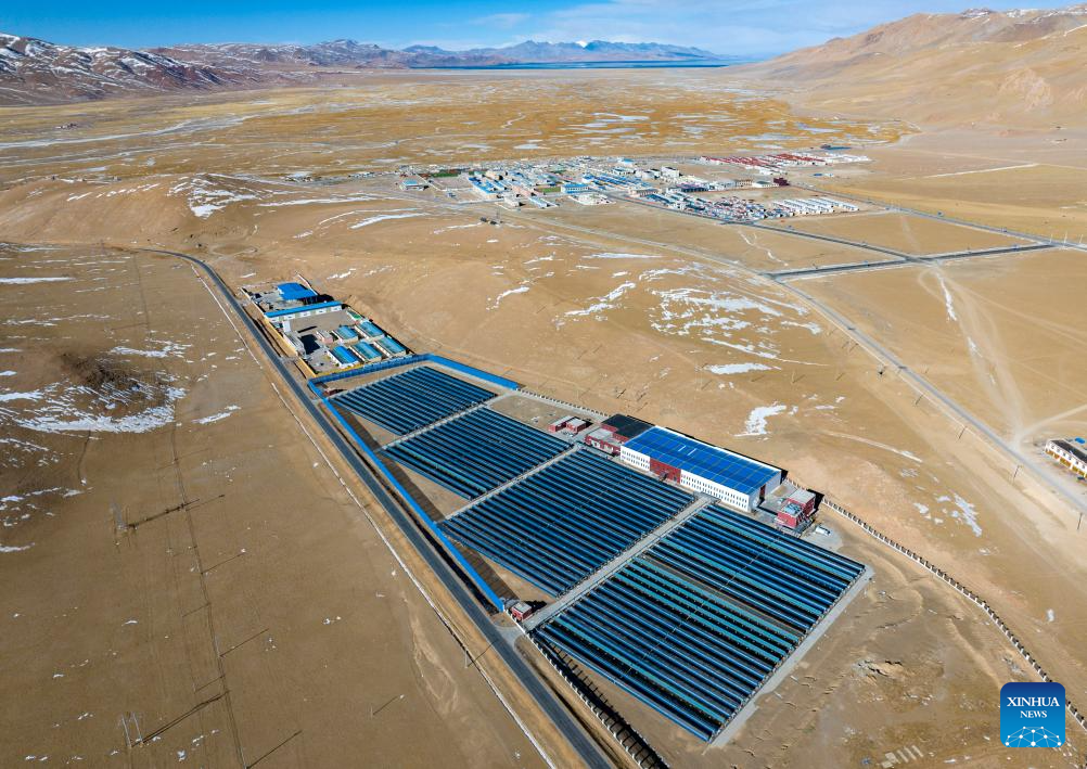 This aerial photo taken on Jan. 6, 2024 shows solar thermal collectors at a heating plant in Xainza County, southwest China's Xizang Autonomous Region. (Xinhua/Tenzing Nima Qadhup)