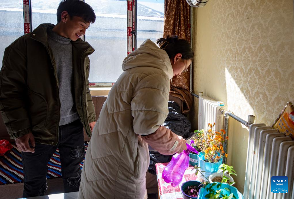 Residents take care of their potted plants at home with heating facilities in Xainza County, southwest China's Xizang Autonomous Region, Jan 6, 2024.?(Xinhua/Jiang Fan)