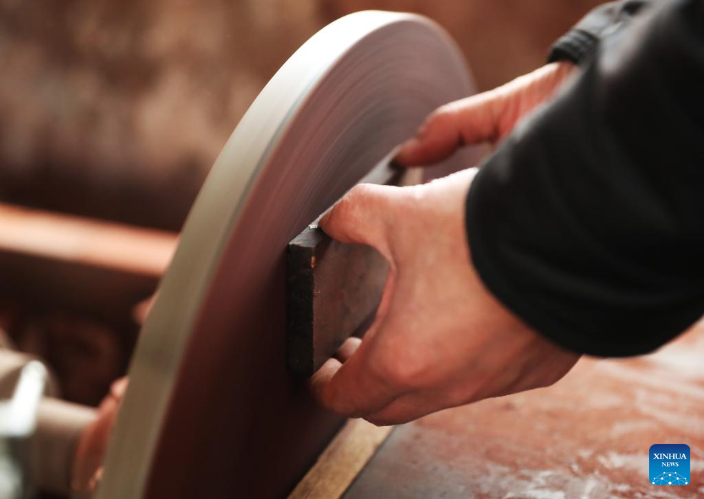 Gong Zhiguang grinds a block for erhu making in Changtu County of Tieling City, northeast China's Liaoning Province, Dec. 28, 2023. (Xinhua/Yang Qing)