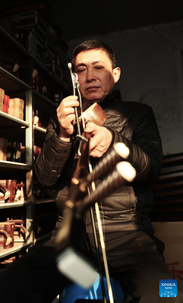 Gong Zhiguang inspects an erhu in Changtu County of Tieling City, northeast China's Liaoning Province, Dec. 28, 2023. (Xinhua/Yang Qing)