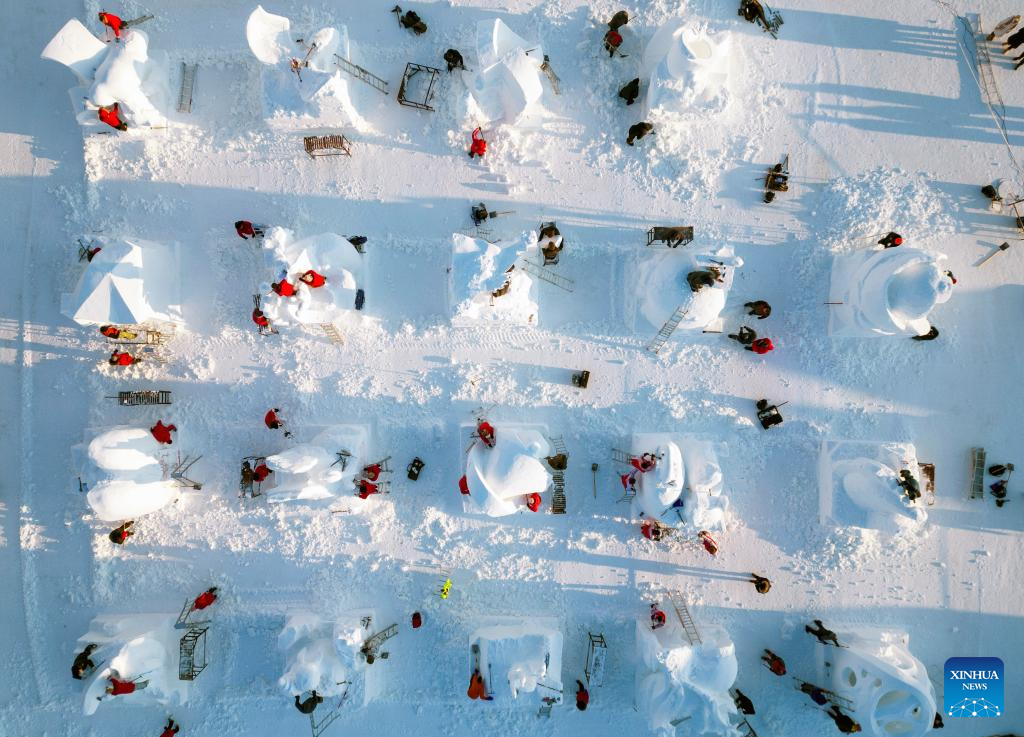 This aerial photo taken on Jan. 7, 2024 shows contestants working on snow sculptures at the Sun Island scenic area in Harbin, northeast China's Heilongjiang Province. An international snow sculpture competition is held here, attracting snow sculptors from 12 countries. (Xinhua/Wang Jianwei)