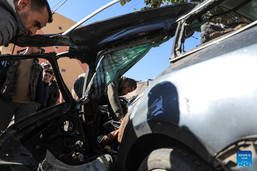 People check the vehicle damaged by an Israeli airstrike in the southern Gaza Strip city of Rafah, on Jan. 7, 2024. (Photo by Rizek Abdeljawad/Xinhua)
