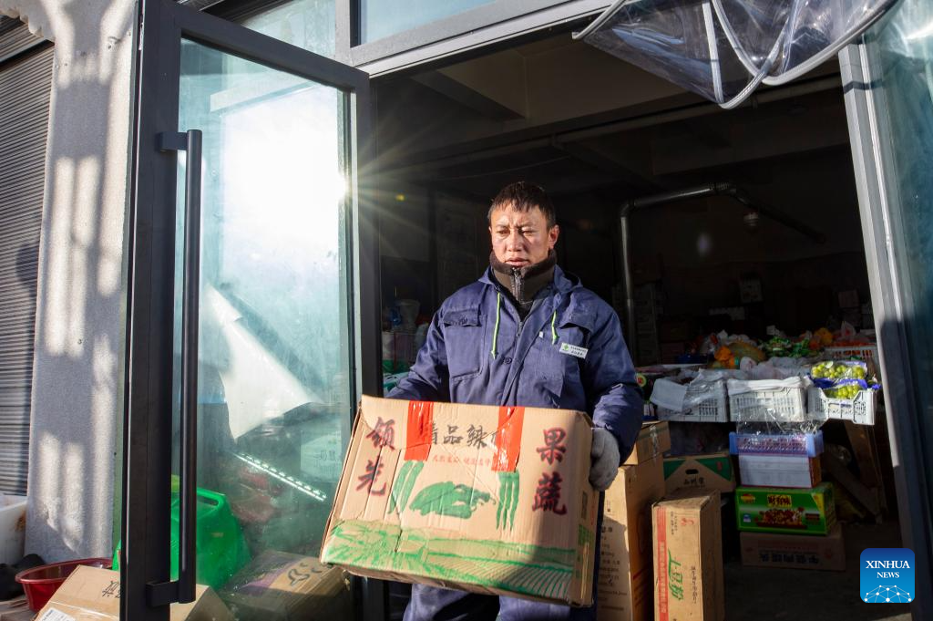 Sherab Gyatso, a store manager, sorts out vegetables delivered here by Xainza County's Supply and Marketing Cooperative at a direct sales store in the remote Beiga No.4 Village in Xainza County, southwest China's Xizang Autonomous Region, Jan. 5, 2024. (Xinhua/Jiang Fan)