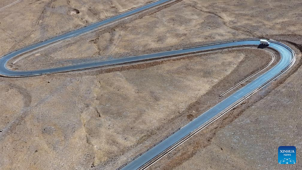 This aerial photo taken on Jan. 5, 2024 shows a truck loaded with fresh fruits and vegetables running on a mountain road toward the remote Beiga No.4 Village, 150 kilometers away from Xainza County, southwest China's Xizang Autonomous Region. (Xinhua/Tenzing Nima Qadhup)
