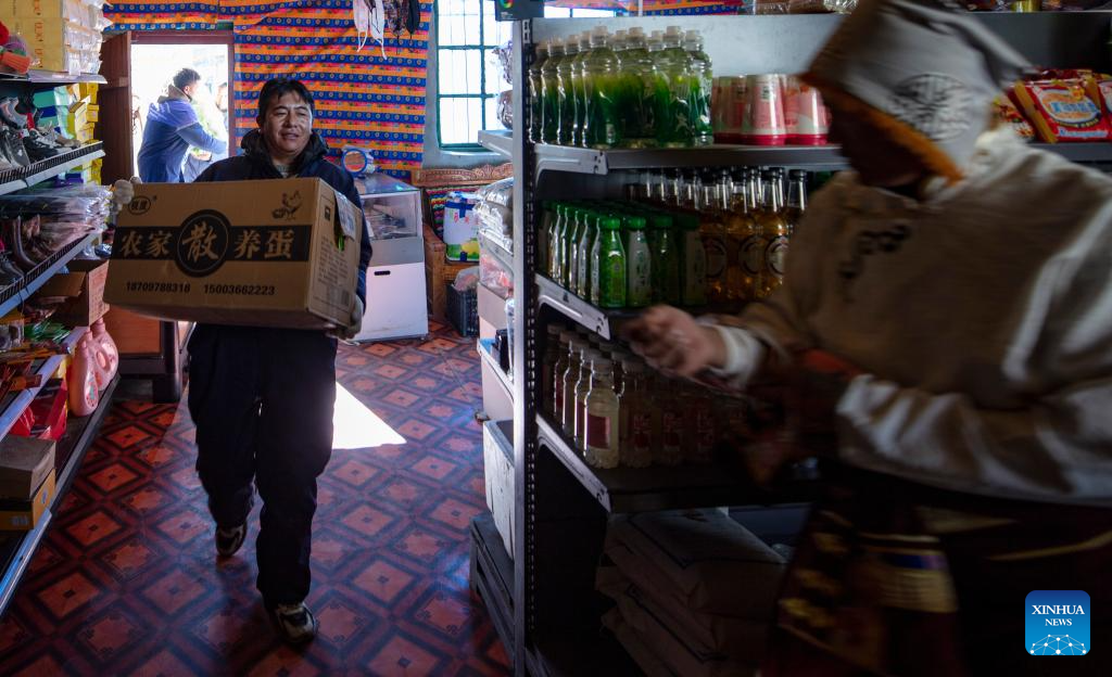 Tsering Samdrup, a distributor of Xainza County's Supply and Marketing Cooperative, prepares goods to be delivered to a direct sales store in the remote Beiga No.4 Village, at the central store in Xainza County, southwest China's Xizang Autonomous Region, Jan. 5, 2024. (Xinhua/Cao Bin)