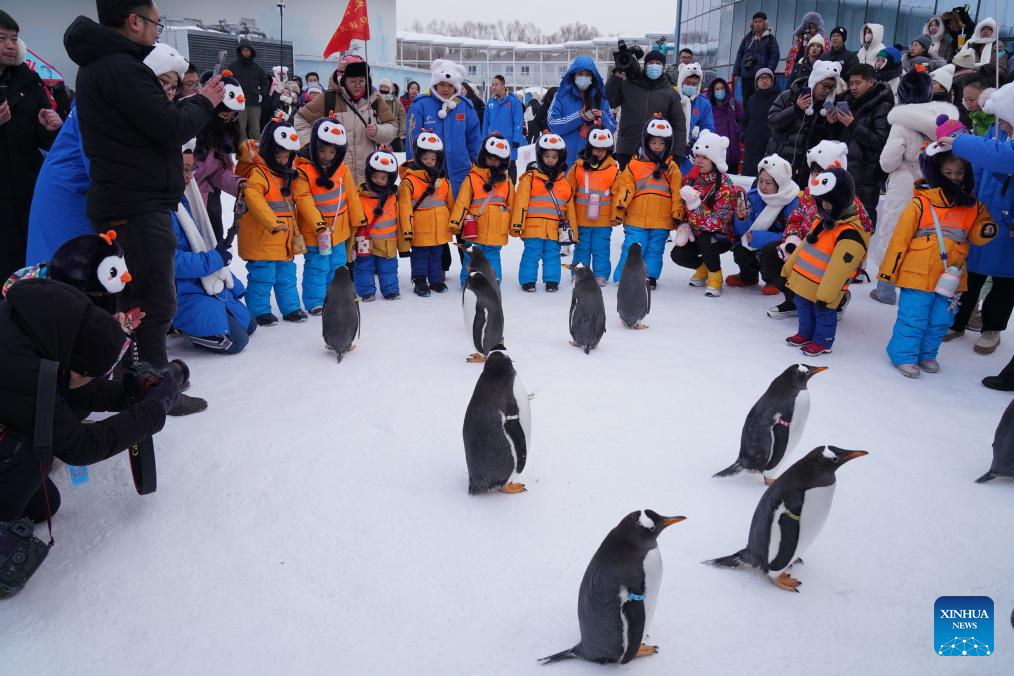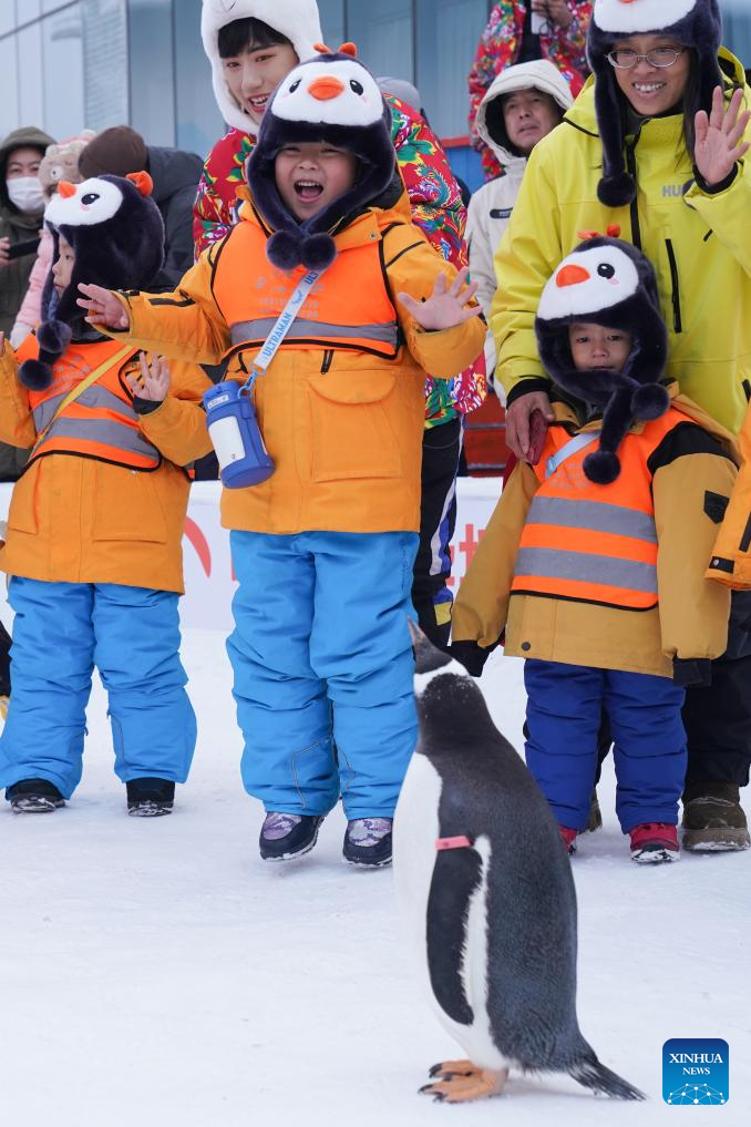 Children from south China's Guangxi Zhuang Autonomous Region meet with penguins as they visit the Harbin Polarpark in Harbin, northeast China's Heilongjiang Province, Jan. 6, 2024. These cute kids, nicknamed "little sugar tangerines" (a specialty produce of Guangxi) by netizens in China, have attracted millions of eyes during their trip to the northeast part of the country. (Xinhua/Zhang Tao)