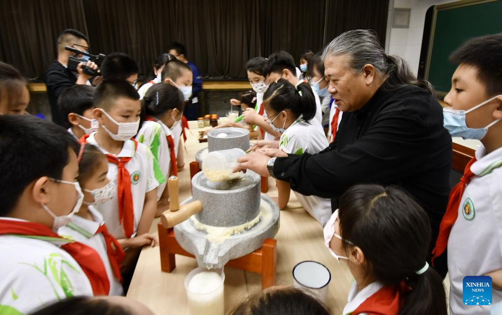 Yang Xin tells a story of traditional life in Beijing to pupils of a primary school in Dongcheng District of Beijing, capital of China, May 31, 2021. (Xinhua/Li Xin)