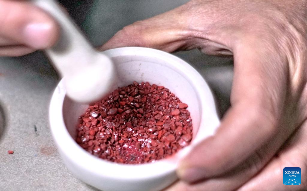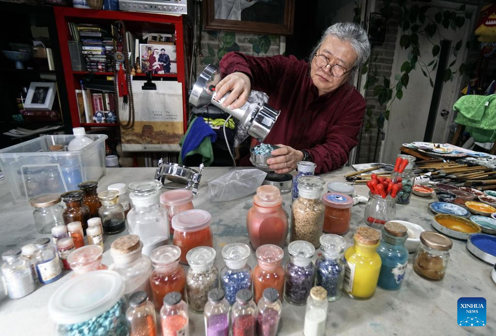 Yang Xin makes pigment with colourful minerals at his studio in Beijing, capital of China, Jan. 4, 2024. (Xinhua/Li Xin)