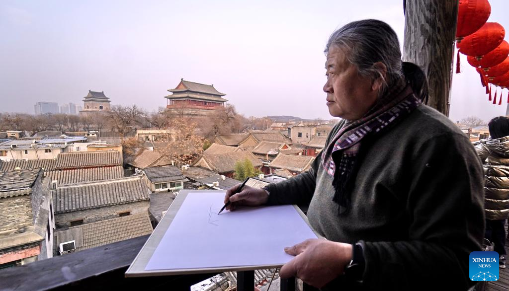 Yang Xin sketches from life in Houhai of Beijing, capital of China, Dec. 30, 2023. (Xinhua/Li Xin)