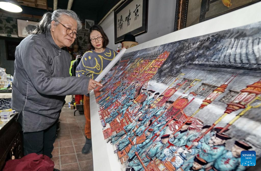 Yang Xin (R) introduces one of his traditional Beijing paintings to visitors at his studio in Beijing, capital of China, Jan. 4, 2024. (Xinhua/Li Xin)