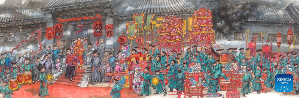 Yang Xin shows his 7-meter-long painting at his studio in Beijing, capital of China, Jan. 4, 2024. (Xinhua/Li Xin)