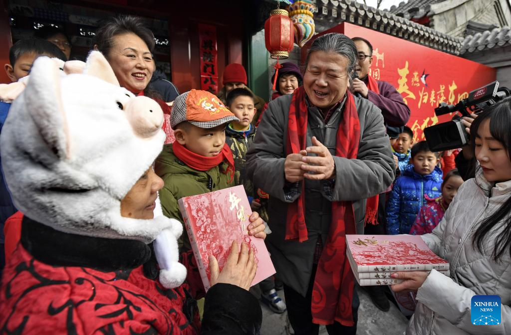 Yang Xin hands out his books on traditional Beijing folk customs to local residents in Beijing, capital of China, Feb. 3, 2019. (Xinhua/Li Xin)
