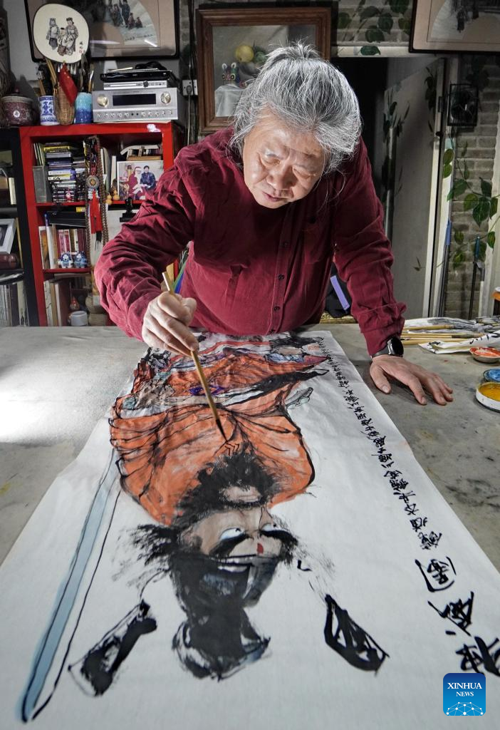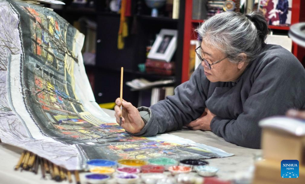 Yang Xin paints with traditional pigment at his studio in Beijing, capital of China, Jan. 4, 2024. (Xinhua/Li Xin)